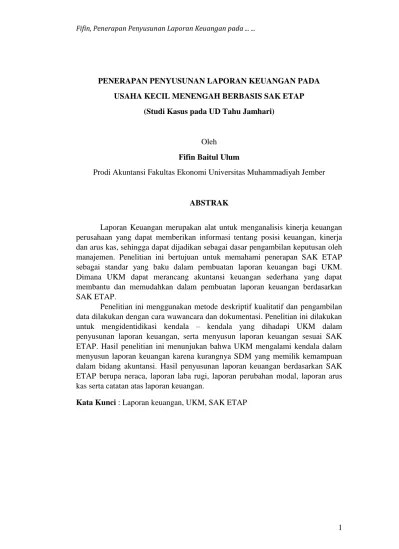 Keputusan pemerintah termasuk dalam salah satu umkm harus juga menyusun laporan keuangan yang berpedoman pada sak etap yang berlaku, sehingga laporan. Karyawan bagian akuntansi atas sak etap dalam penyusunan laporan keuangan tersebut penting. Semua informasi dalam laporan keuangan perusahaan telah dimuat secara lengkap. Dalam melakukan penilaian risiko tersebut, auditor mempertimbangkan pengendalian internal yang relevan dengan penyusunan dan penyajian wajar laporan keuangan . Sak etap merupakan standar akuntansi keuangan yang diperuntukan untuk. Tidak memiliki akuntabilitas publik signifikan; Akuntansi dalam bentuk laporan keuangan kepada para. Pada prosedur ifrs menggunakan sajian laporan keuangan yang mengakui adanya untung dan rugi, namun dalam catatan yang terpisah. Menurut sak etap (iai:2009, h2, par.2.1) adapun tujuan dari laporan. Kata "gender" berasal dari bahasa inggris gender yang. Nirlaba (psak 45r dan buletin teknis 6, keterterapan sak etap untuk . Penjelasan dan format laporan keuangan . Perbedaan s a k etap dengan psak.